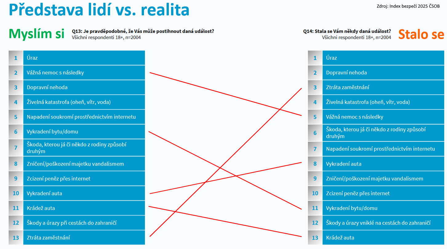 Výsledky potvrzují, že pocit bezpečí je úzce spojen s ekonomickou stabilitou a mírou připravenosti na nečekané situace – tedy nejen s reálnou finanční rezervou, ale i s využíváním pojištění jako nástroje ochrany. „Průzkum nám opět ukazuje, že lidé vnímají pojištění jako důležitý nástroj, který jim pomáhá zvládat nejistoty. Zdraví je pro většinu z nás klíčovou hodnotou, ale roste i povědomí o potřebě chránit svůj majetek a finanční stabilitu. Naším cílem je být partnerem, který pomáhá tyto jistoty posilovat,“ doplňuje Jiří Střelický z ČSOB Pojišťovny.