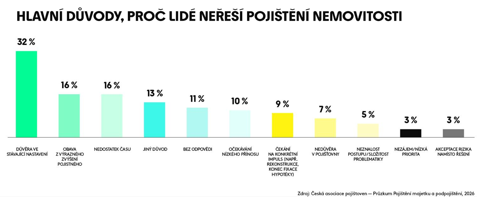 Češi o podpojištění nemovitostí přitom vědí, většina ale své pojistné smlouvy stejně neřeší. Zatímco 72 % lidí uvádí, že v posledních měsících téma podpojištění zaznamenali, do akce – tedy aktualizace smlouvy – se pustilo jen 28 %. Proč lidé pojistku neaktualizují? Téměř třetina dotázaných jako hlavní důvod pasivity uvedla přesvědčení, že mají pojistku nastavenou správně. Dalšími překážkami jsou obava ze zdražení pojistného (16 %) a nedostatek času (16 %).