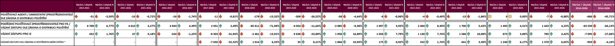 Další tabulka zobrazuje meziroční vývoj (nárůst či úbytek). Porovnání je na letech 2014 vs. 2015; 2015 vs. 2016; 2016 vs. 2017; 2017 vs. 2018; 2018 vs. 2019; 2019 vs. 2020; 2020 vs. 2021; 2021 vs. 2022; 2022 vs. 2023; 2023 vs. 2024; 2024 vs. 2025 a na závěr i celkové srovnání od začátku sledovaného období (tedy od 20.01.2014). Údaje jsou jak v počtech poradců, tak i v procentech.