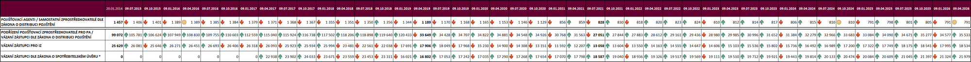 V první tabulce jsou zobrazeny počty jednotlivých PA/SZ, počty PPZ/VZ v nich zasmluvněných a počty VZ pro investice i pro spotřebitelské úvěry. V porovnání je vždy, vůči předchozímu období, znázorněn nárůst zelenou šipkou směřující nahoru, pokles červenou šipkou směřující dolu a stav beze změny je znázorněn žlutým „semaforovým“ kolečkem.