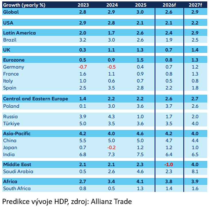 Dopad na růst HDP by se pohyboval od 0,2procentního bodu v USA (na 2,1 % v roce 2026) po 0,4procentního bodu v eurozóně (na 0,8 % v roce 2026). Analýza Allianz Trade předpokládá, že centrální banky tento dočasný cenový šok většinou přehlédnou, přičemž ECB a Bank of England zvýší sazby mírně o 25 bazických bodů v dubnu a FED ponechá sazby beze změny. Celkově by globální růst HDP měl v roce 2026 dosáhnout 2,6 %, oproti předpokládaným 3,1 % před konfliktem.
