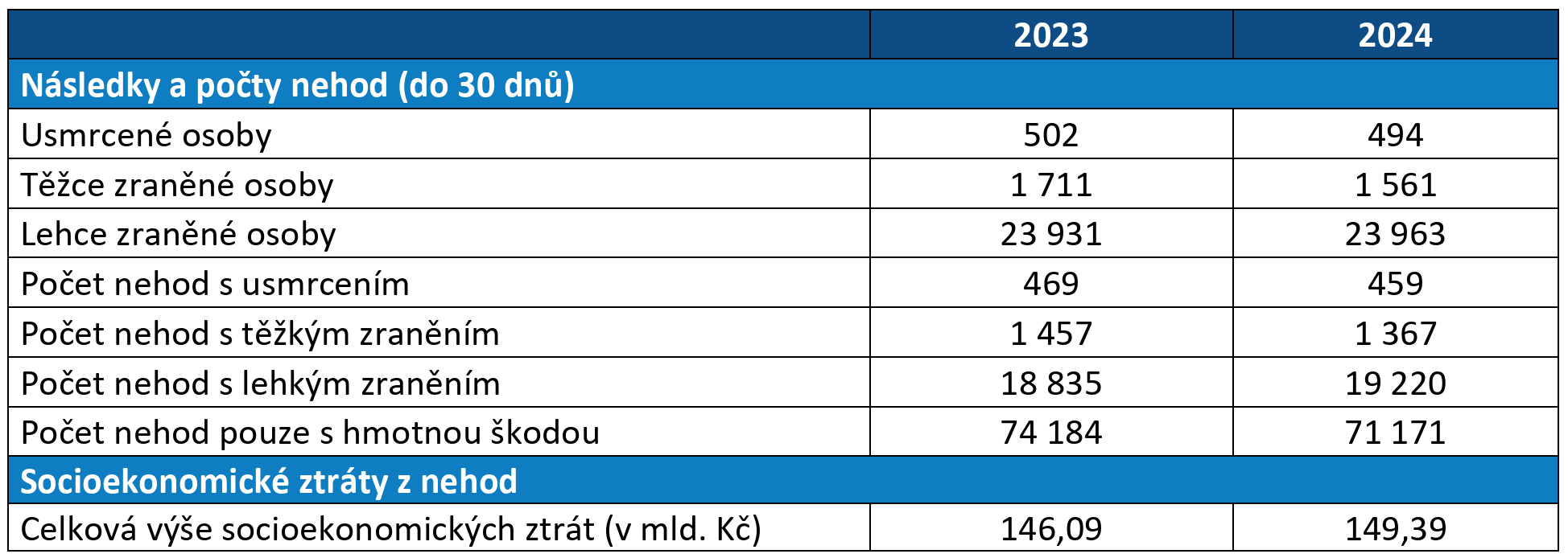 Srovnání nehodovosti a následků nehod dle údajů do 30 dnů po nehodě v letech 2023 a 2024 zobrazuje Tabulka 1. V roce 2024 bylo oproti roku 2023 evidováno méně usmrcených i těžce zraněných osob, jen počet lehce zraněných osob byl nepatrně vyšší. Celkový počet nehod byl v obou letech podobný (v roce 2024 pokles o 2,9 %). Obdobná byla i závažnost dopravní nehod, která v roce 2024 činila 5,36 usmrcených osob do 30 dnů na 1 000 dopravních nehod (v roce 2023 byla závažnost 5,29).