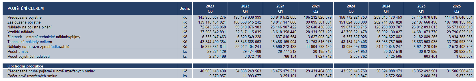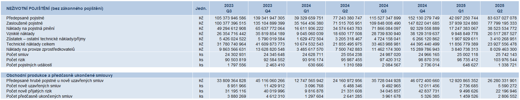 Dynamický vývoj životního pojištění se týká i ostatního (rizikového) životního pojištění, kde plnění nadále roste o 16 %, resp. o 456 mil. Kč a, nicméně počty pojistných událostí se v tomto odvětví snížily cca o 6 %. Cca 7,5% navýšení pojistného plnění představující meziročně růst o cca 114 mil. Kč zaznamenalo i zdravotního pojištění, kde za stejné období počet řešených pojistných událostí navíc narostl o téměř 7 %. Hrubé předepsané pojistné u životního pojištění se zahrnutím přeshraničních aktivit roste 6,5% tempem, a oproti prvnímu pololetí 2024, kdy dosahovalo 28,97 mld. Kč, stouplo na aktuálních 30,84 mld. Kč.