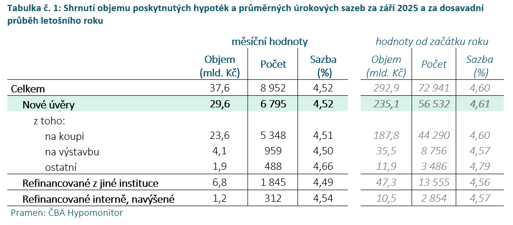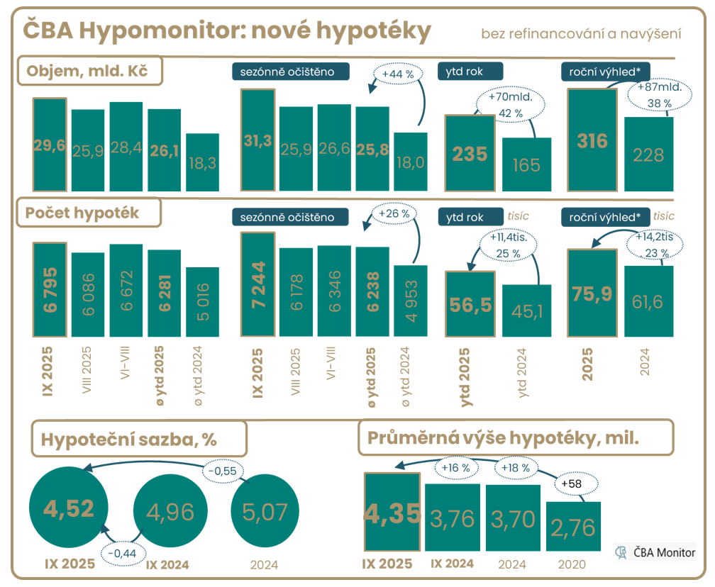 Větší poměr refinancovaných úvěrů odpovídá současnému trendu a bude pravděpodobně sílit. Objem refinancovaných a navýšených úvěrů (interně či z jiné instituce) v září stoupl na 8 mld. Kč. To je o 104 % více než průměrných 3,9 miliardy refinancovaných v loňském roce a o 272 % nad 2,2 miliardami refinancovanými v roce 2023. Podíl refinancovaných úvěrů na celkovém objemu poskytnutých hypoték nepatrně klesl na 21,3 %. Ovšem zůstává výrazně nad loňským 17% průměrem či z let 2022-2023, ale zůstává pod téměř 29% podílem z období 2020-2021, kdy domácnosti refinancovaly za hypoteční sazbu 2,14 %. V září 2025 se domácnosti refinancovaly za úrokovou sazbu 4,5 %, což je ovšem stále o výrazných 0,36 % bodu méně než 4,86 % před rokem. Celkově tak banky a stavební spořitelny v září poskytly nové a refinancované hypotéky v objemu 37,6 mld. Kč, což je o 13,3 % více než před měsícem. Jejich celkový objem tak v letošním roce prozatím dosáhl 293 mld. Kč, což představuje 47% nárůst ve srovnání s lednem až zářím předcházejícího roku.