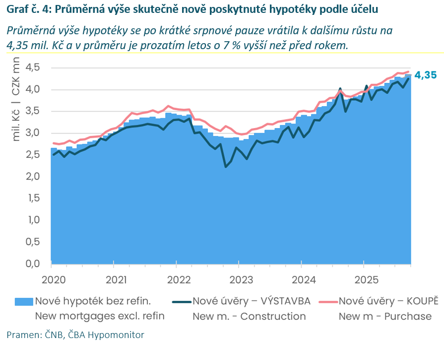 Průměrná velikost skutečně nově poskytnuté hypotéky v září mírně stoupla na 4,35 mil. Kč, tedy více než o 2 % meziměsíčně. Její velikost je tak o 16 % vyšší než 3,76 mil. Kč před rokem. Odhlédneme-li od mimořádné hodnoty téměř 4 mil. Kč v srpnu 2024 (vliv nové legislativy), tak průměrná hodnota od loňského dubna postupně roste a o 26 % převyšuje předcházející rekordní úroveň z listopadu 2021 ve výši 3,46 mil. Kč. Dosáhnout na vyšší hypotéku umožňuje postupný pokles hypotečních sazeb, či o něco silnější růst reálných příjmů domácností (3,9 % meziročně v Q2-2025 či graficky zde), společně s pokračujícími uvolněnými makroobezřetnostními limity ohledně příjmů ze strany ČNB (pouze 80% limit LTV či 90 % v případě žadatelů mladších 36 let). Rostoucí výše hypotéky pak souvisí také s vývojem cen bytů, které si dle údajů společnosti Flat Zone v druhém čtvrtletí roku 2025 udržely stále silný 10% meziroční růst (viz grafy na ČBA Monitoru - ČBA Monitor či v komentáři zde). Data ČSÚ poukazují na nárůst cen bytů okolo 15 % meziročně a celkový index cen nemovitostí okolo 10 % meziročně v prvním čtvrtletí 2015 (viz komentář zde).