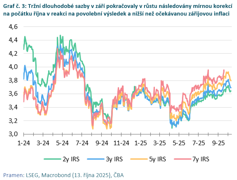 Tržní úrokové sazby,[1] které mají klíčový vliv na hypoteční sazby, v září dále vzrostly (také kvůli volbám a očekávaní volnější fiskální politiky), což bude v budoucnu asi limitovat další výraznější pokles hypotečních sazeb. České pětileté úrokové swapy v září stouply o 0,11% bodu na 3,78 % ze srpnových 3,67 % a nacházely se nad červencovými 3,65 %. Jejich zářijová úroveň je o 0,12% bodu pod 3,66 % z předcházejícího druhého čtvrtletí. V posledních dvanácti měsících se české pětileté swapy pohybovaly v rozmezí měsíčních průměrů 3,29 % (v dubnu 2025) a 3,78 % (v září 2025). V porovnání s průměrnou úrovní pětiletých swapů v roce 2025 byly zářijové úroky o 0,2% bodu výše. V případě amerických pětiletých úrokových swapů došlo v září k jejich poklesu na 3,57 % ze srpnových 3,69 % (v očekávání dalšího snižování úrokové sazby centrální banky) a nacházely se 0,55% bodu pod jejich průměrnou hodnotou z roku 2024. Eurové pětileté swapy v září zůstaly v podstatě beze změny na 2,36 % (což také odráží očekávání nezměněné úrokové sazby ECB) a byly 0,22% bodu pod jejich průměrnou loňskou úrovní 2,58 %.
