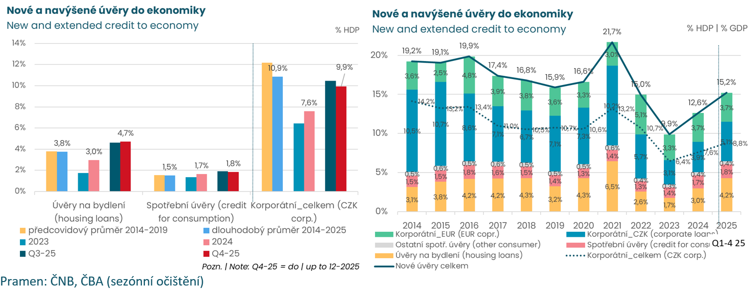 Celkově by klientské úvěry měly v letošním roce mírně zrychlit svůj růst na 6,4 % meziročně se strukturou odpovídající růstu české ekonomky. Zde máme na mysli pokračující růst úvěrů domácnostem o 7,2 % meziročně, tedy obdobně jako v roce 2025, a zároveň očekáváme zrychlení i růstu úvěrů nefinančním podnikům přes 5 % meziročně po 4 % v roce 2025. Do celkové dynamiky se odráží nejen soustavně silné objemy nově sjednaných úvěrů na bydlení, ale i výrazné oživení nových úvěrů pro korporátní sektor, kde rovněž došlo ke zmírnění dominance cizoměnových úvěrů. Rok 2027 by měl, i s ohledem na přetrvávající oživení investiční aktivity ponechat silný růst úvěrů podnikům blížící se 5,5 % a rovněž přinést mírné zpomalení růstu úvěrů domácnostem na 6,6 %.