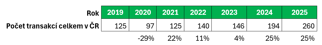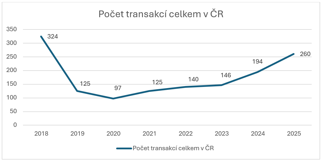 Podle RSM se v roce 2025 zvýšil počet transakcí v segmentu pod pět milionů dolarů na úroveň 145, a zároveň pokračovala aktivita v kategorii od pěti do dvaceti milionů dolarů na úroveň 77 transakcí, ty nad 20 milionů dolarů se vyšplhaly na 38 transakcí. Celkový počet transakcí v Česku se tak ustálil na 260, což je oproti loňským 194 nárust o 25%, oproti předloňským 146 nárust o 78%. Tento vývoj souvisí s postupnou konsolidací na trhu a zvyšujícím se trendem ve vazbě na generační obměnu vlastníků, která se stává jedním z hlavních motorů trhu a bude podle RSM hrát zásadní roli v roce 2026. „V segmentu malých a středních transakcí vidíme stabilní poptávku. Řada obchodů se nezveřejňuje, ale na základě našich projektů a podílu na trhu potvrzujeme rostoucí aktivitu,“ doplňuje Zdražilová.