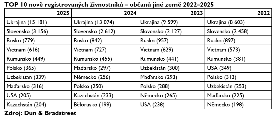 Mezi zahraničními žadateli o živnostenské oprávnění v posledních letech jednoznačně dominují občané Ukrajiny. Celkem jich má živnostenský list více než 73 699, a jen za rok 2025 jich o živnostenské oprávnění požádalo 15 181. „V posledních čtyřech letech počet nových ukrajinských podnikatelů na našem trhu dynamicky roste, což zřejmě souvisí s migrací v důsledku vojenského konfliktu,“ dodala Kateřina Klosová z Dun & Bradstret. Za Ukrajinci s výrazným odstupem následují Slováci a dále Rusové a Vietnamci. Počet nově vydaných živnostenských oprávnění se pro Slováky v posledních třech letech zvyšoval, zatímco v případě Rusů a Vietnamců klesá.