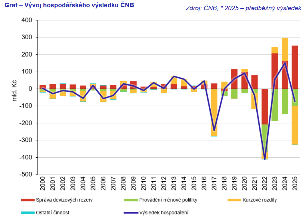 Kurzové pohyby v průběhu roku 2025 převážily nad výrazným zhodnocením devizových rezerv, na kterém se příznivě projevila strategie současné bankovní rady navyšovat podíl akcií a průběžně dokupovat zlato. Pokud by kurz koruny zůstal od začátku roku stabilní, ČNB by dosáhla zisku přibližně 150 miliard Kč – výnosy z rezerv by pokryly všechny náklady na měnovou politiku i provoz. Na samotnou položku „správa devizových rezerv“ připadal v roce 2025 zisk 252,7 miliardy Kč, nejvíce v historii ČNB. Výnos devizových rezerv v rezervních měnách činil 10,3 %. U akciových portfolií byl výnos přibližně 21 %, u zlata dokonce přes 60 %.