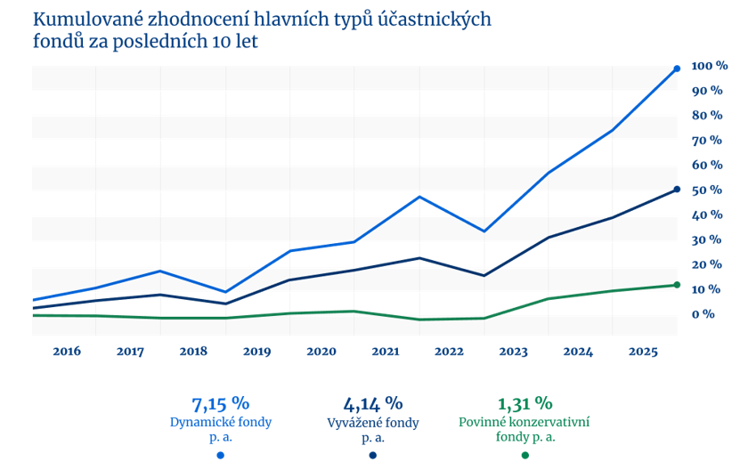 Za poslední dekádu každoročně v průměru dynamické fondy, které jsou z většiny tvořeny akciovou složkou, zhodnotily o 7,15 %. Výnos vyvážených fondů, které tvoří mix akcií a dluhopisů, ročně dosáhl 4,14 %. Všechny výnosy uvedené výše jsou čisté výnosy po započtení poplatků. PKF pak slouží především jako fondy výstupní – tedy peníze se do nich postupně převádějí v závěrečné fázi investování pro ochranu účastníka.