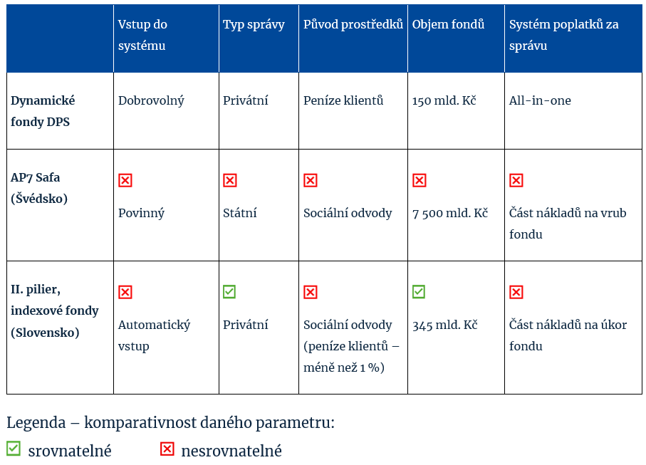Resumé: Český třetí pilíř je s fondy, které předkládá studie CERGE-EI, nesrovnatelný. Z důvodu zcela odlišných (v případě Slovenska velmi odlišných) parametrů systémů nelze férově srovnat nákladovost těchto systémů. Studie v oblasti komparace s trochou nadsázky říká, že pokud by se v Česku zavedl zhruba před 15 lety povinný dynamicky investující druhý pilíř, který by neziskově spravoval stát a který by byl plněný částí sociálních odvodů pracujících, mohl by tu dnes existovat na správu velmi levný nástroj, ve kterém by měli Češi na penzi už opravdu vysoké částky. To může být pravda, ale současný třetí pilíř to nevylepší.