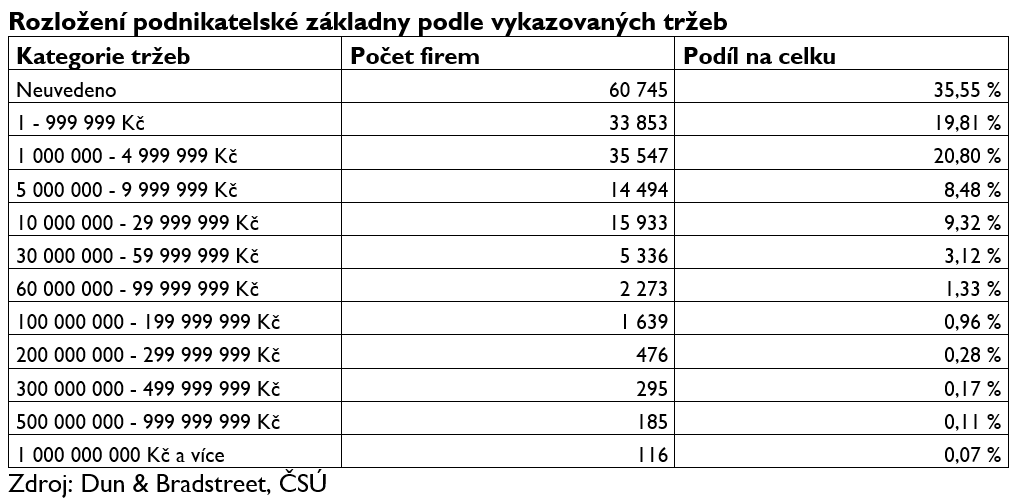 Z pohledu vykazovaných tržeb se většina subjektů řadí mezi mikro firmy – 55 % podle klasifikace ČSÚ tržby neuvádí nebo vykazuje tržby do jednoho milionu korun ročně. Pětina firem má tržby v intervalu od jednoho do pěti milionů, od pěti do třiceti milionů téměř 18 % sledovaných subjektů. Od této hranice zastoupení společností na podnikatelské základně prudce klesá. Tržby přesahující 100 milionů vykazuje méně než dvě procenta firem.