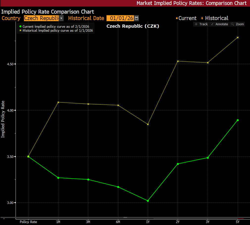 Trh novou komunikaci ČNB již reflektuje. Zatímco před pouhým měsícem předpokládal, že během jednoho roku se základní sazba ČNB zvýší z nynější úrovně 3,5 procenta na úroveň 3,75 (viz graf agentury Bloomberg: žlutá křivka), potenciálně dokonce na rovná čtyři procenta, nyní jako s nejpravděpodobnějším počítá se scénářem jejího poklesu na tři procenta (tentýž graf: zelená křivka). Během měsíce se tak sazba ČNB v ročním výhledu trhu snížila až o jeden procentní bod. To není málo. Snížila se navzdory navýšení plánovaného letošního schodku. Které tudíž za jakkoli zásadní, totiž proinflační, nepovažují ani trhy samotné, tedy čeští i zahraniční investoři.
