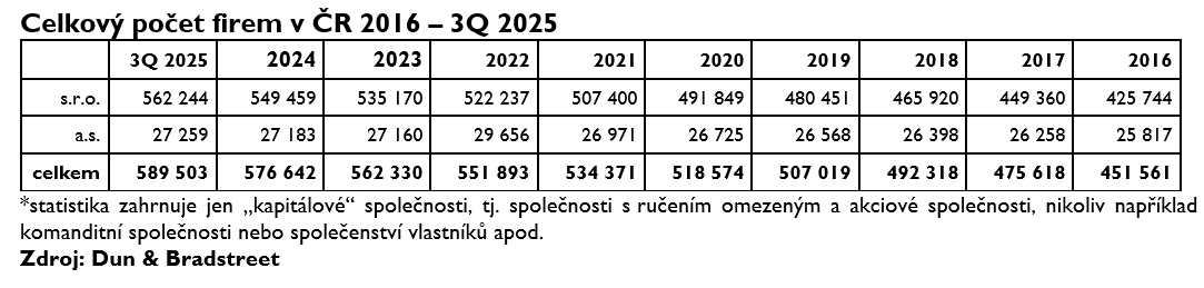 Aktuálně je v ČR registrováno 589 503 firem, o 16 532 než ve stejném období roku 2024.
