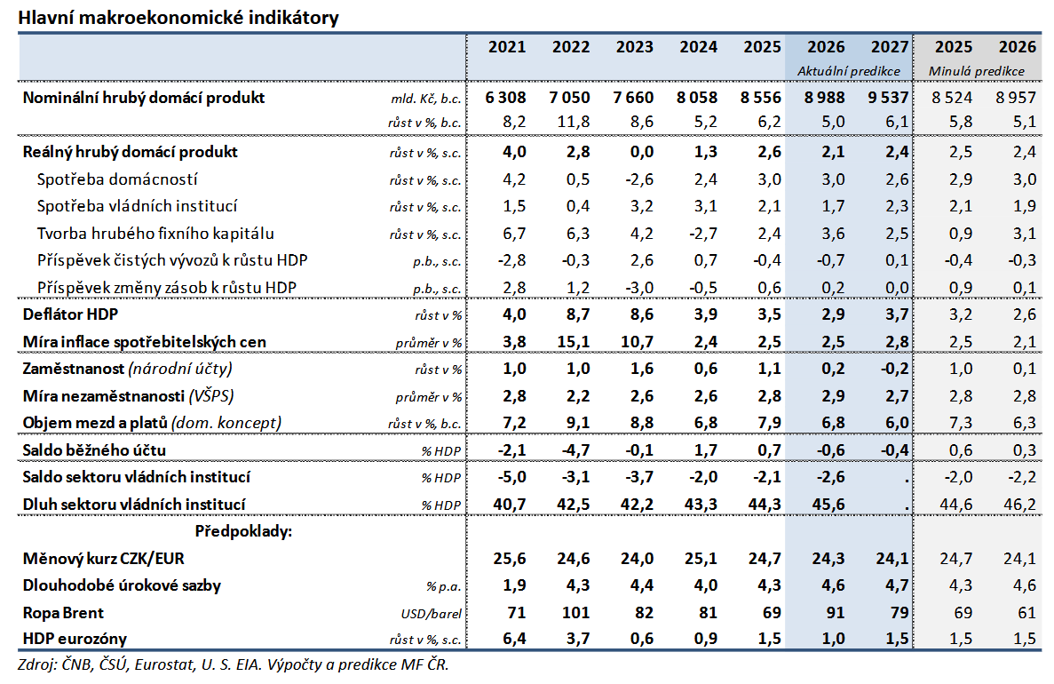 Podle základního scénáře makroekonomické predikce MF by měla česká ekonomika v roce 2026 zpomalit na 2,1 %. Dynamika bude nadále tažena výlučně domácí poptávkou, kterou však bude brzdit zvýšená nejistota a nárůst cen energií kvůli konfliktu na Blízkém východě. Kromě pokračujícího růstu spotřeby domácností dojde k oživení investiční aktivity firem. To vše navýší objem dovozu, přičemž stranu vývozu budou limitovat zvýšené obchodní bariéry a nadále nízký objem exportních zakázek. Příspěvek zahraničního obchodu k růstu HDP by tak měl zůstat záporný. V roce 2027 by mohl HDP vzrůst o 2,4 % díky zrychlení hospodářského růstu hlavních obchodních partnerů a pokračujícímu růstu domácí ekonomické aktivity.