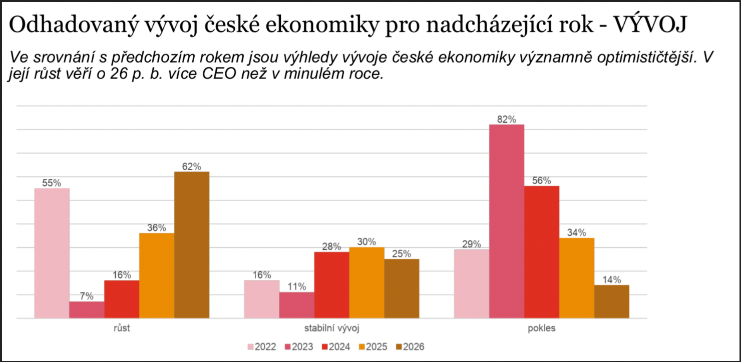 - Na pokles sází pouze 14 % CEOs (2025: 34 %, 2024: 56 %)