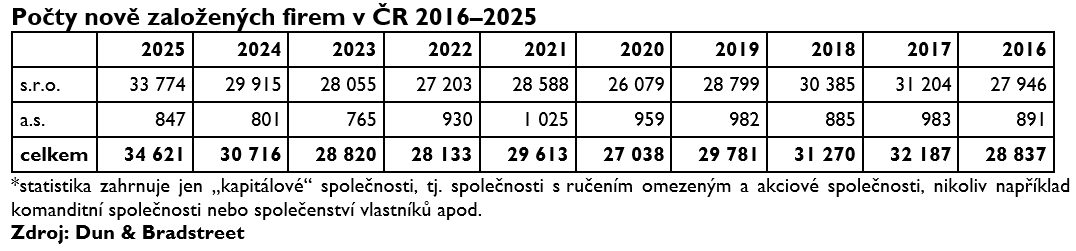 V loňském roce bylo založeno 34 621 nových firem, z toho 847 (2,4 %) akciových společností a 33 744 (97,6 %) společností s ručením omezeným. „Společnost s ručením omezeným je dlouhodobě jednou z nejoblíbenějších právních forem pro podnikání v ČR. Důvodem jsou nízké požadavky na základní kapitál, snadnější řízení a nižší byrokracie ve srovnání s akciovou společností a tím i nižší náklady na správu a v neposlední řadě nižší riziko pro vlastníky srovnání s podnikáním na živnostenský list,“ uvedla dále Kateřina Klosová z Dun & Bradstreet s tím, že meziročně podíl společností s ručením omezeným v rámci podnikatelské základny mírně vzrostl.