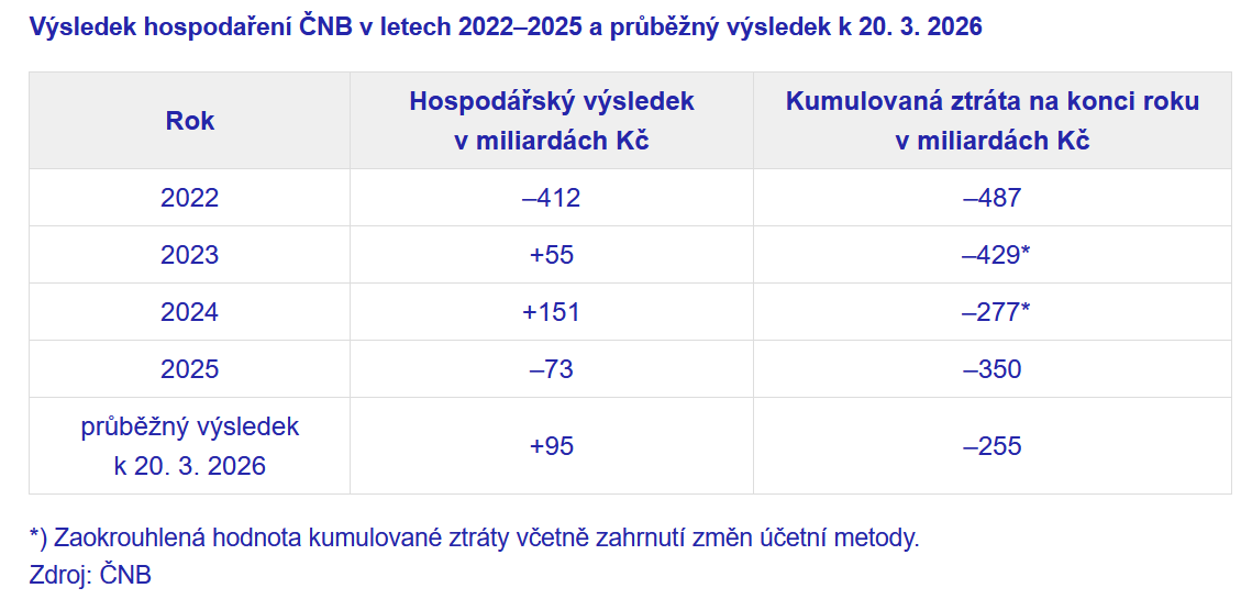 „V roce 2023 jsme byli v zisku 55 mld. Kč. V roce 2024 jsme byli v zisku 151 mld. Kč. Nelze ale mít každý rok zisk. V roce 2025 jsme byli ve ztrátě 73 mld. Kč, i když výnosově na aktivech v eurech a dolarech jsme měli rekordní rok. V roce 2026 jsme k 20. březnu zatím v zisku 95 mld. Kč. Poslední měsíce jsou ale výrazně ovlivněny pohybem kurzu koruny. Výnosy máme v eurech a dolarech, účetnictví v korunách. Loni koruna výrazně posílila, což nás stáhlo účetně do ztráty. Za tři roky 2023–2025 dosáhla ČNB kumulovaného zisku 133 mld. Kč. Od roku 2023 až do 20. března 2026 dosáhla ČNB kumulovaného zisku 228 mld. Kč. Podstatné je, že aktiva již jsou sestavena tak, že mají dlouhodobě vyšší očekávaný výnos, než jsou předpokládané náklady na pasiva. Budou roky, kdy budeme ve ztrátě. Dlouhodobě bychom ale měli být v zisku. Pokud se vyrovná kumulativní ztráta a vytvoří rezervní fond, budou moci naši následovníci v souladu se zákonem o ČNB odvádět část zisku do státního rozpočtu,“ vysvětluje guvernér ČNB.