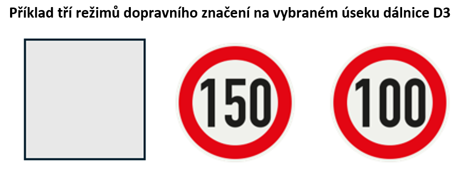 Na úseku dálnice D3 mezi Planou nad Lužnicí a Úsilným u Českých Budějovic je dohromady 42 proměnných dopravních značek. Možnost využít vyšší rychlost je pouze v případě, že značka zobrazí nejvyšší dovolenou rychlost „150“. Pokud na značkách není žádný číselný údaj, platí režim obecné úpravy provozu, tedy nejvyšší rychlost 130 km/h. Ve třetím případě může značka zobrazit snížený rychlostní limit na 100 km/h. - Co když prší nebo je hustý provoz?