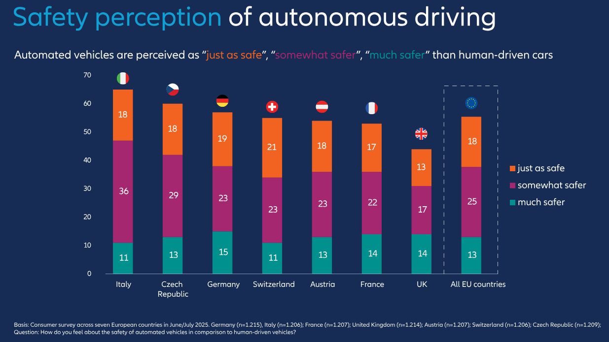 V rámci zjišťování míry důvěry v autonomní vozidla a jejich přijímání provedla společnost Allianz reprezentativní spotřebitelský průzkum v sedmi evropských zemích (Rakousko, Německo, Francie, Itálie, Švýcarsko, Česká republika a Velká Británie). Výsledky ukazují širokou důvěru ve zlepšení bezpečnosti, ale také zdůrazňují nejistotu ohledně technologické vyspělosti.