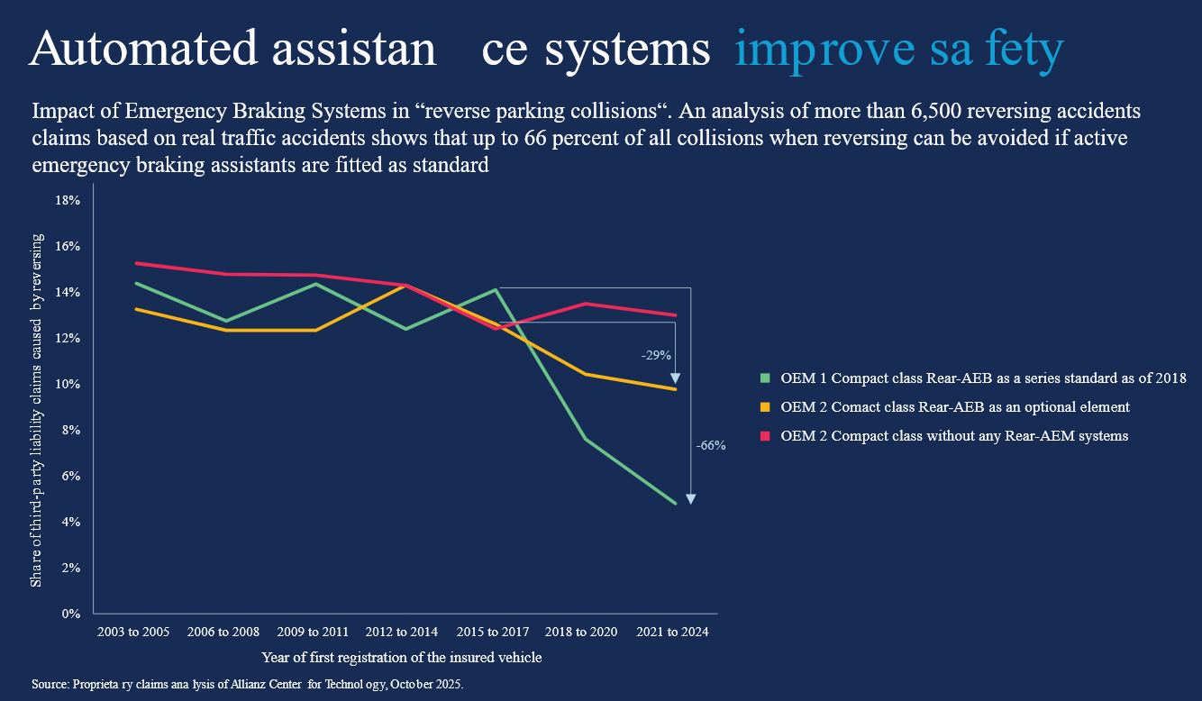 Systémy ADAS s automatickým nouzovým brzděním (AEB) již v dnešních automobilech tento vysoký bezpečnostní potenciál potvrzují. Na základě analýzy 20 000 pojistných událostí z pojištění motorových vozidel u Allianz byl počet nárazů do zadní části vozidla v plynulém provozu v průměru o 30 % nižší v případech, kdy byl jako standard instalován systém AEB. Ty nejpokročilejší systémy pak snížily počet nehod při couvání při parkování o 66 procent.
