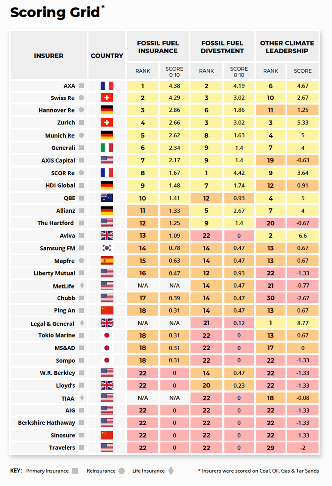 Na opačném konci žebříčku jsou seřazeny AIG, Berkshire Hathaway, Lloyd´s Sinusore, Travelers a W.R. Berkley. Ty klidně nadále a bez omezení uhelné aktivity pojišťují. „Zatímco Allianz svá pravidla o výlukách pojišťování uhlí letos nadále prohloubila, čeká se doposud bez efektu na podobný vývoj u ropy a zemního plynu. Tady Allianz stále nedostála své vlastní ambici být pionýrem v oblasti klimatické ochrany,“ upozornila Regina Richter, energetická aktivistka z hnutí urgewald.